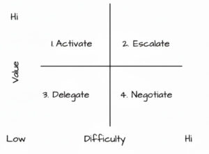 - Take the action that the system dictates – Activate (just do it), Negotiate, Delegate or Escalate.
